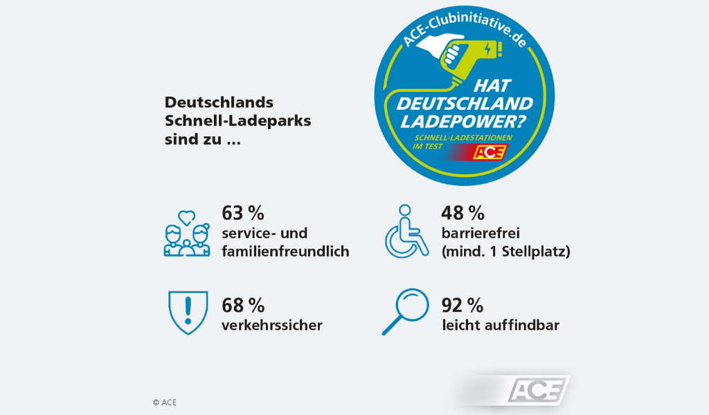 Berlin (ACE) – Seit April haben rund 200 Ehrenamtliche des ACE bundesweit unter dem Motto „Hat Deutschland Ladepower?“ 189 Schnell-Ladestationen mit 1.737 Ladepunkten unter die Lupe genommen. Im Fokus standen die Kategorien Ladeleistung, Bezahloptionen, Bedienbarkeit, Barrierefreiheit, Verkehrssicherheit und Service & Familienfreundlichkeit. Getestet wurden nur Anlagen, die über mindestens zwei Ladesäulen mit mindestens je zwei Ladepunkten verfügen und an einer Autobahn oder einer Bundesstraße liegen. Das Fazit des ACE, Europas Mobilitätsbegleiter, zum großen Service-Check: Die Ladesäulen sind besser als ihr Ruf – nur drei Anlagen sind bundesweit durchgefallen.