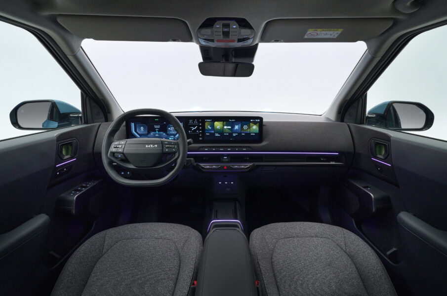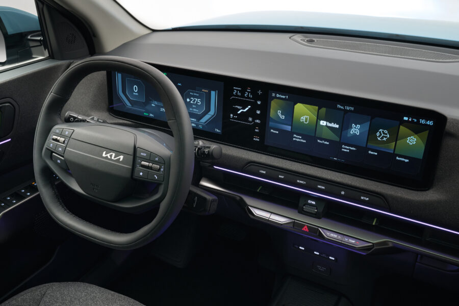 Im Cockpit setzt Kia auf ein großzügiges Panorama-Display, bestehend aus zwei 12,3-Zoll-Bildschirmen und einem separaten 5,3-Zoll-Segment für die Klimasteuerung. Dank des flachen Bodens der Elektro-Plattform bietet der Innenraum überraschend viel Platz.